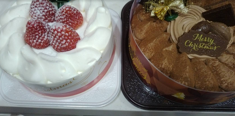 昨夜の晩酌のおつまみは、なんと!ヤマザキのクリスマスケーキの4号(イチゴ)と5号(生チョコ)を1/4ずついただきました。