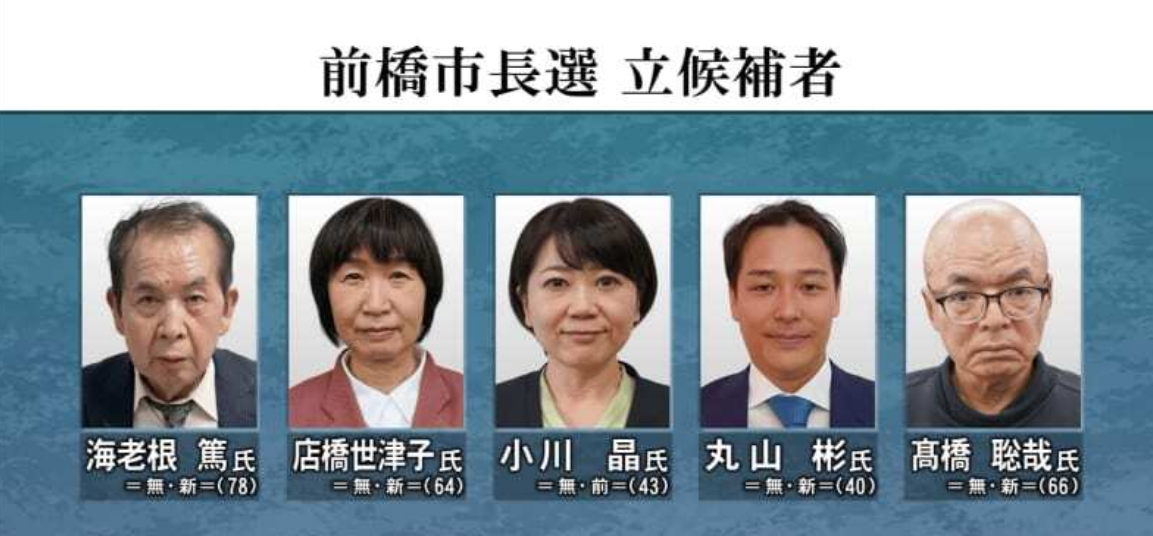 この前橋市長選に立候補したのは、届け出順にいずれも無所属で、 元みどり市議で新人の海老根篤さん(78)・ 元前橋市議で共産党が推薦する新人の店橋世津子さん(64) ・問題の前市長の小川晶さん(43)・ 弁護士で新人の丸山彬さん(40) ・農業で新人の髙橋聡哉さん(66)の5人。