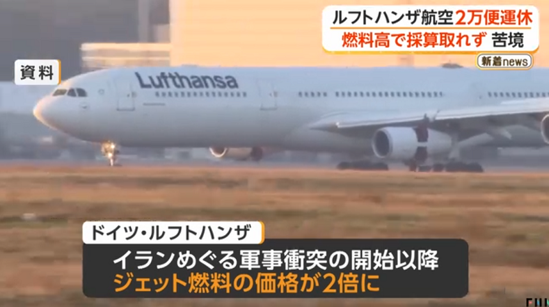 中東情勢の悪化による燃料高騰でドイツの航空大手ルフトハンザが、短距離便を中心に10月までに2万便を運休すると発表。